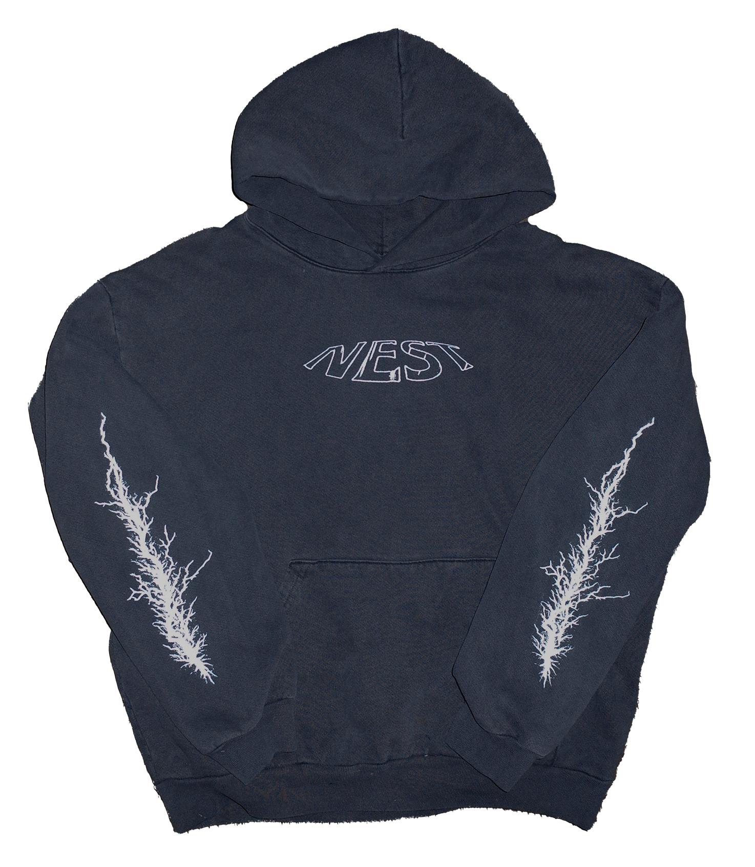 フロントプリントと袖プリントが施された14オンスの厚手のブラックパーカー。
